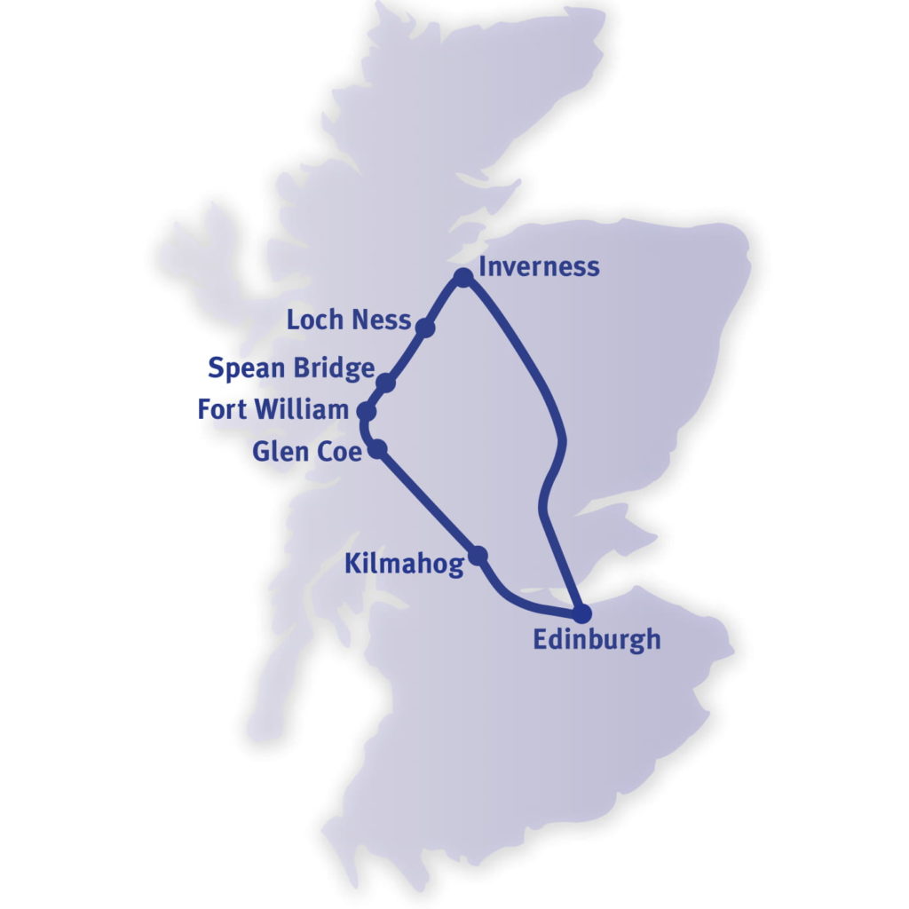 On the return journey we pass Inverness and travel south through the stunning Perthshire countryside towards the world famous Forth Rail Bridge and back to Edinburgh.
